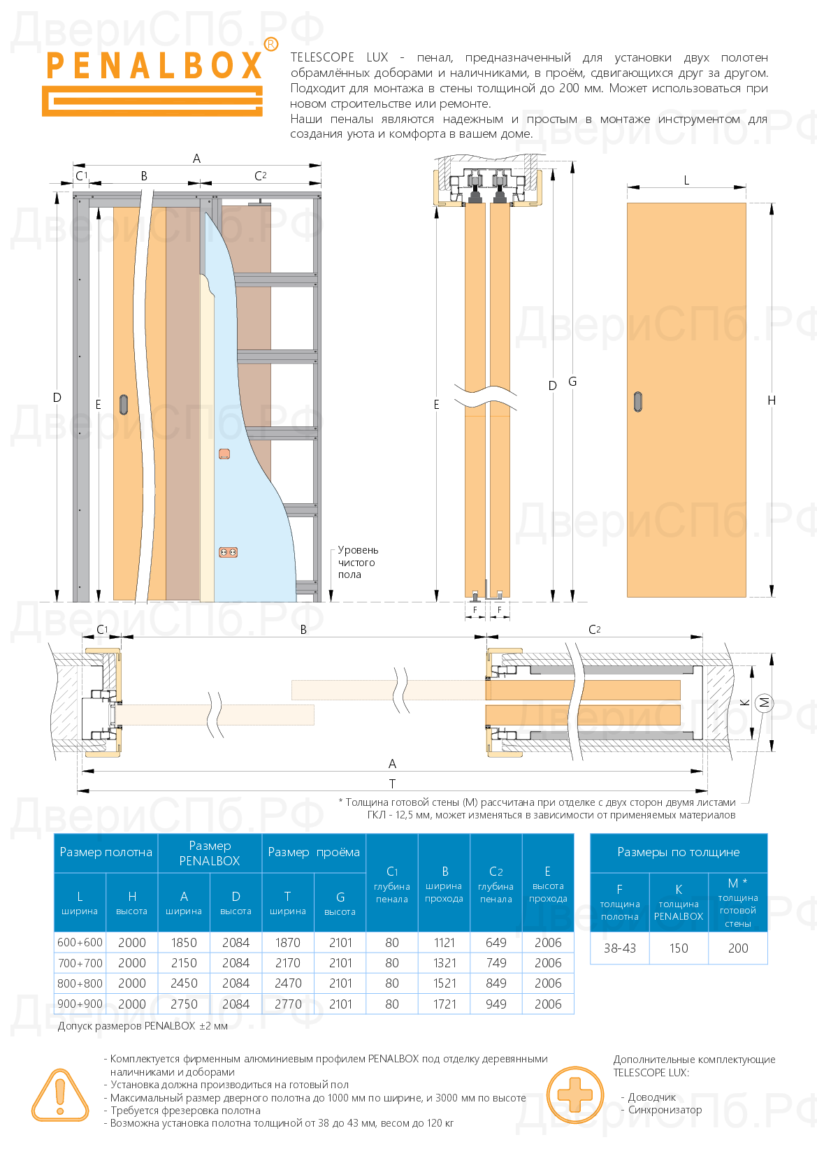 Телескопический пенал позволяет сдвигать в сторону 2 полотна друг за другом. Модель Lux предназначена под отделку наличниками. Обшивается гипсокартоном. Финишная толщина 200 мм. Высота может быть скорректирована при монтаже вплоть до 1 мм. Срок изготовления 1-3 недели.